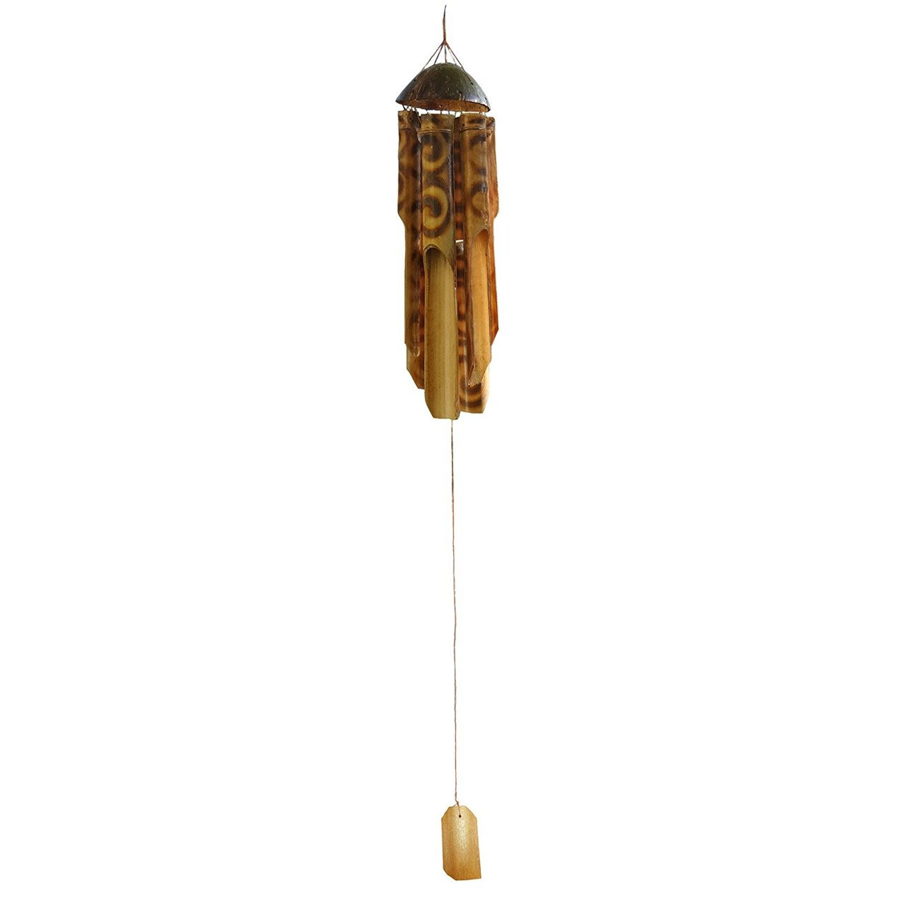 Made from lengths of natural bamboo which have been beautifully decorated with a scrolling pattern. A metal hand tool is heated until extremely hot and the design is quickly and expertly burnt into the bamboo surface. The top is made from coconut shell and all components have been treated with water-resistant varnish. Handmade and fairly traded from Bali. Suitable for outdoor use. Please note: product will fade and age with time. To prolong the life of the wind chime, we recommend that you hang it indoors during the winter. Dimensions: Total hanging length: 68 cms Diameter of coconut shell: 13 cms Diameter of bamboo chimes: 2 cms - 3 cms. This product is made from natural materials. Dimensions may vary slightly. Materials: Varnished bamboo and coconut shell, waxed thread, metal hanging hook.