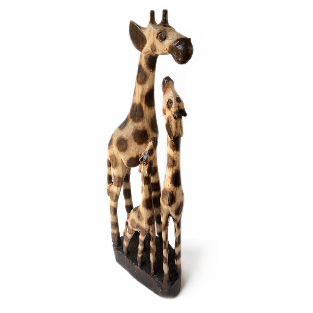A charming hand carved wooden figure featuring a family of giraffes. They're handmade in Bali, by a small family run business whose skills have been passed down through generations. Made from Albesia wood which is a fast-growing wood that is always farmed, making it sustainable. Imported directly by Present Company to our ethical standards. Dimensions: H50 x W17 x D9CM