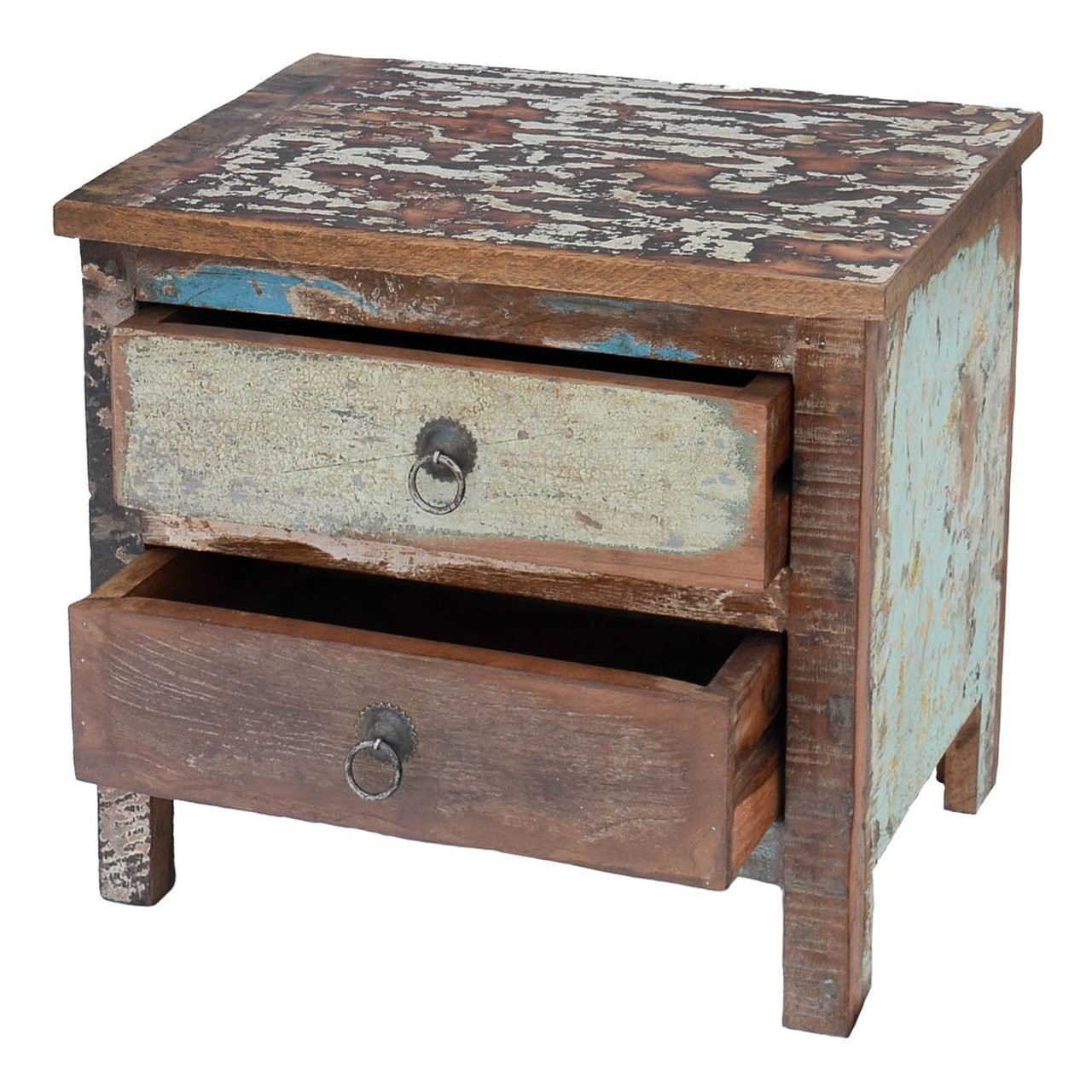 A useful little piece of furniture that would make a great bedside unit in a guest bedroom, or a lamp table where space is limited. Made from reclaimed hardwood floorboards with traces of paint remaining; mostly in shades of cream and blue/green. The doors are nicely finished with chunky hand forged O ring handles and have drawer stops that prevent the drawers falling too far forwards. Old India furniture is manufactured from a variety of woods. We endeavour to identify the type(s) of wood contained within each item, but this is not always possible. Do not place your furniture in bright sunlight or near to a heat source, ie: close to a radiator. In highly centrally-heated rooms, some slight cracking and settling of the wood may occur - this will not affect the integral strength of the piece. Use protective mats/coasters to guard against damage from heat and damp mop up any spillages immediately using a dry cloth. Dust using a soft cloth and polish occasionally using a traditional paste or wax polish. We do not recommend the use of aerosol-type sprays. Height: 40cm Width: 45.00cm Depth: 28cm